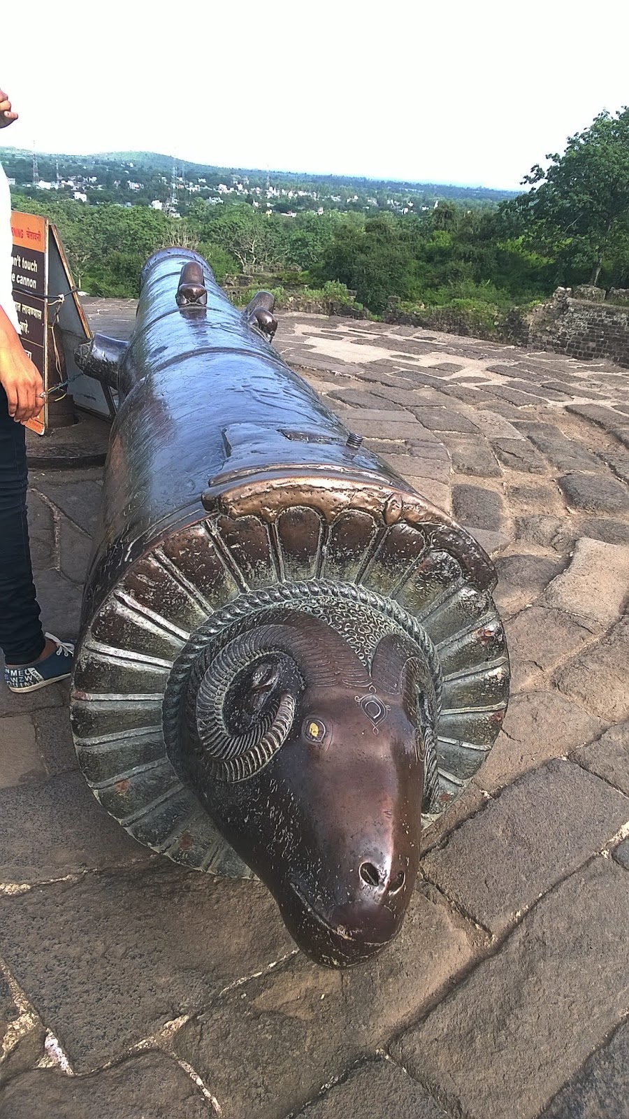 Schodami docieramy do ruin Chini Mahal, czyli Pałacu Chińskiego. Został on zbudowany przez cesarza Aurangzeba (jednego z największych władców dawnych Indii) jako więzienie dla można to tak ująć VIP-ów. Jego najsłynniejszym lokatorem był pokonany przez cesarza Abul Hasan Qutb Shah, ostatni król Golkondy, którą opisywałem wam w jednym z postów o Hajdarabadzie. Obecnie nie jest już w najlepszym stanie, ale za czasów świetności był wyposażony dosyć luksusowo i niekoniecznie przypominał więzienie. Na szczycie jego najwyższej baszty znajduję olbrzymie działo 6-cio metrowej długości. Jest odlane z pięciu różnych metali i jest zdobione wersetami z Koranu. Również tylna część armaty, zwana fachowo gronem jest ozdobnie odlana w kształcie baraniej głowy.